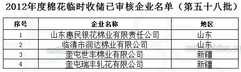 2012年度棉花臨時(shí)收儲(chǔ)已審核企業(yè)名單(第五十八批)