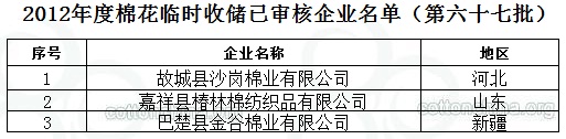 2012年度棉花臨時(shí)收儲(chǔ)已審核企業(yè)名單(第六十七批)