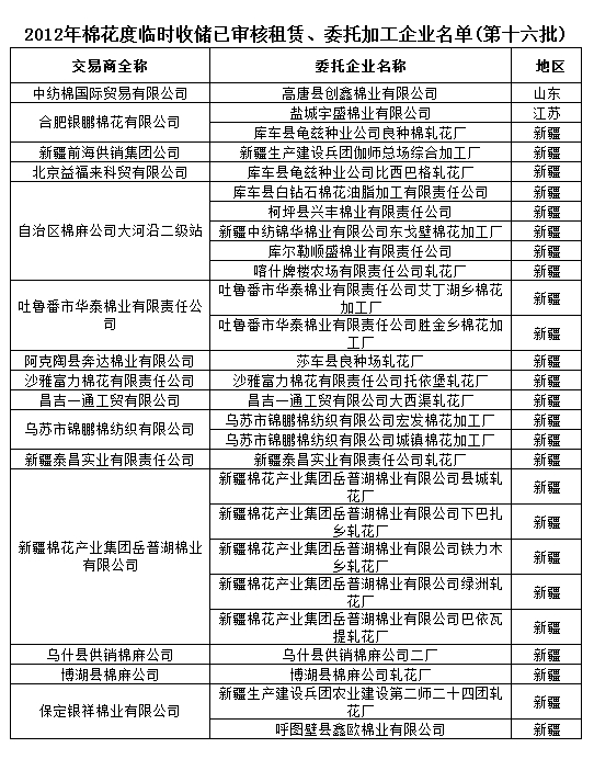 2012年度棉花臨時(shí)收儲(chǔ)已審核租賃、委托加工企業(yè)名單(第十六批)