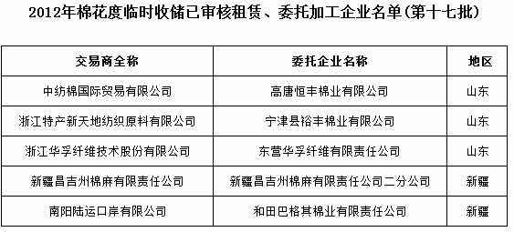 2012年棉花度臨時(shí)收儲(chǔ)已審核租賃、委托加工企業(yè)名單(第十七批)