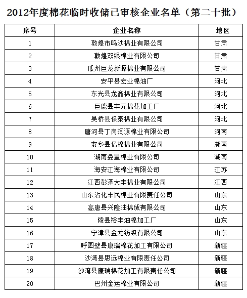 2012年度棉花臨時收儲已審核企業(yè)名單(第二十批)