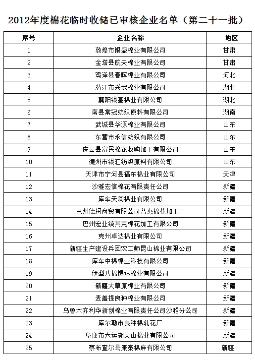 2012年度棉花臨時收儲已審核企業(yè)名單(第二十一批)