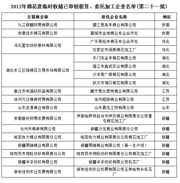 2012年度棉花臨時收儲已審核租賃、委托加工企業(yè)名單(第二十一批)