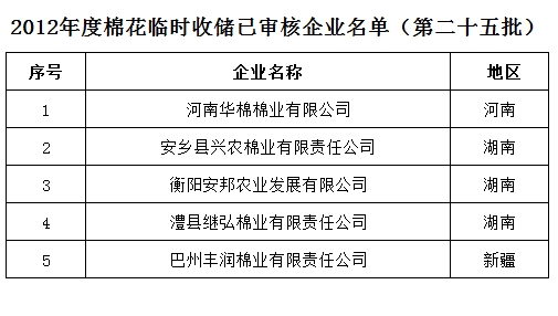 2012年度棉花臨時收儲已審核企業(yè)名單(第二十五批)