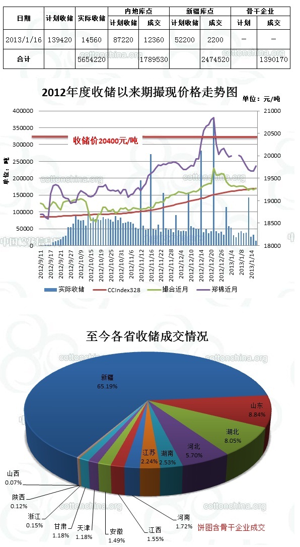 截至今日2012年度棉花臨時(shí)收儲累計(jì)成交5654220噸,新疆累計(jì)成交2474520噸,內(nèi)地累計(jì)成交1789530噸,骨干企業(yè)共累計(jì)成交1390170噸。