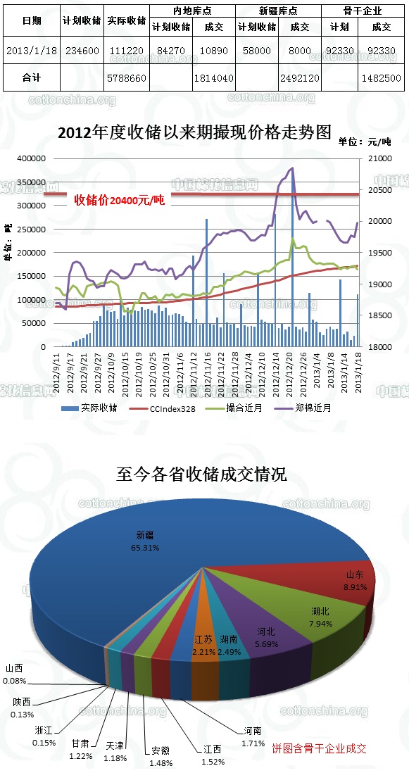 1月18日,計劃收儲234600噸,實際成交111220噸,成交比例47.4%,較前一天增加88000噸。其中新疆庫點計劃收儲58000噸,實際成交8000噸,成交比例13.8%;內(nèi)地庫計劃收儲84270噸,實際成交10890噸,成交比例12.9%;骨干企業(yè)成交92330噸。