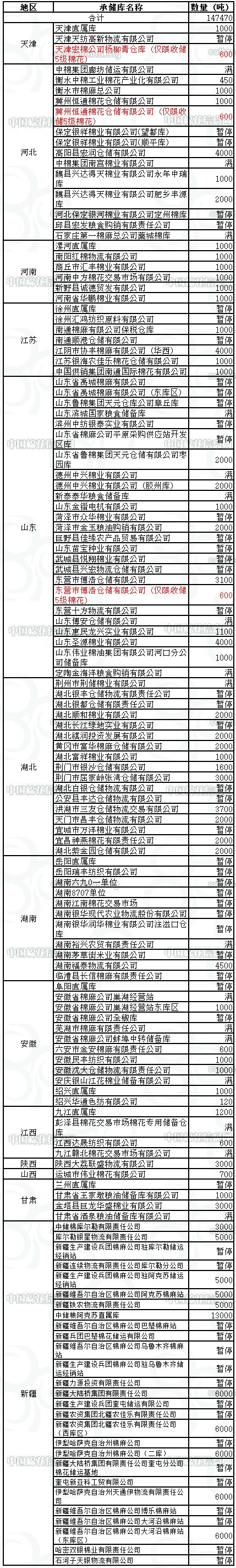 定于元月21日在以下指定倉庫收儲2012年度棉花147470噸。哈密雙銀棉業(yè)有限責(zé)任公司僅限東疆棉花企業(yè)競拍,新疆維吾爾自治區(qū)棉麻公司博樂棉麻站僅限于博樂地區(qū)棉花企業(yè)競拍,以上庫點其他地區(qū)企業(yè)競拍將按違約處理。