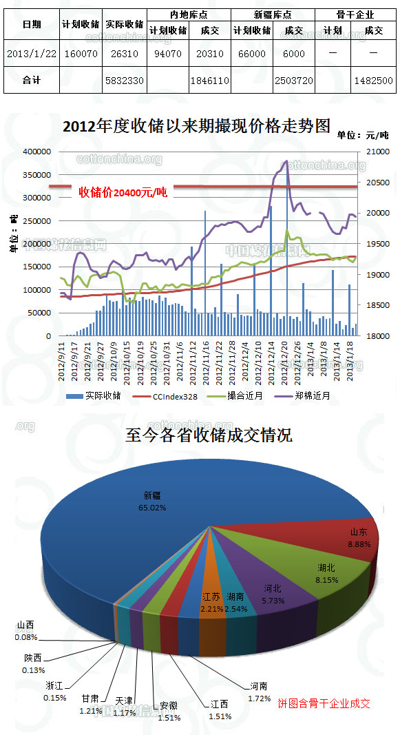 1月22日,計(jì)劃收儲(chǔ)160070噸,實(shí)際成交26310噸,成交比例16.4%,較前一天增加8950噸。其中新疆庫點(diǎn)計(jì)劃收儲(chǔ)66000噸,實(shí)際成交6000噸,成交比例9.1%;內(nèi)地庫計(jì)劃收儲(chǔ)94070噸,實(shí)際成交20310噸,成交比例21.6%。