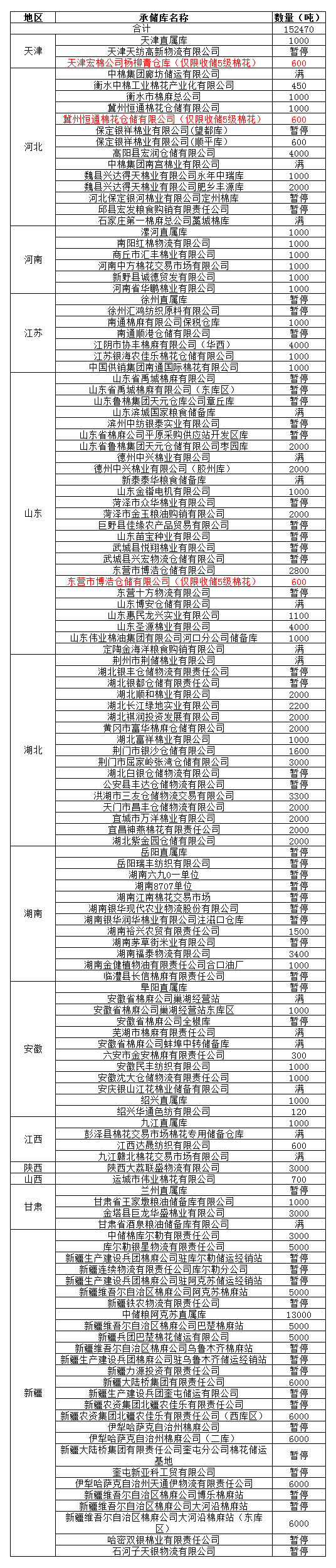 定于1月23日在以下指定倉庫收儲(chǔ)2012年度棉花152470噸。哈密雙銀棉業(yè)有限責(zé)任公司僅限東疆棉花企業(yè)競(jìng)拍,新疆維吾爾自治區(qū)棉麻公司博樂棉麻站僅限于博樂地區(qū)棉花企業(yè)競(jìng)拍,以上庫點(diǎn)其他地區(qū)企業(yè)競(jìng)拍將按違約處理。