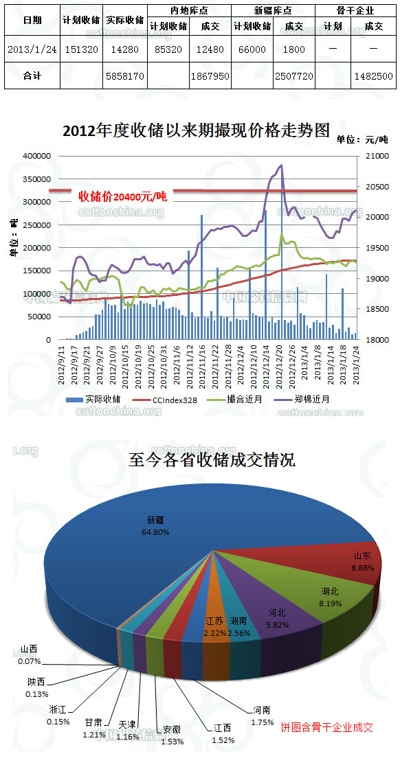 1月24日,計劃收儲151320噸,實際成交14280噸,成交比例9.4%,較前一天增加2720噸。其中新疆庫點計劃收儲66000噸,實際成交1800噸,成交比例2.7%;內(nèi)地庫計劃收儲85320噸,實際成交12480噸,成交比例14.6%。