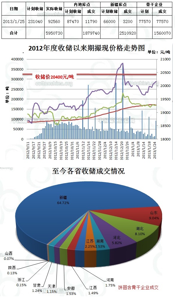 1月25日,計劃收儲231040噸,實際成交92560噸,成交比例40.1%,較前一天增加78280噸。其中新疆庫點計劃收儲66000噸,實際成交3200噸,成交比例4.8%;內(nèi)地庫計劃收儲87470噸,實際成交11790噸,成交比例13.5%。骨干企業(yè)成交77570噸。