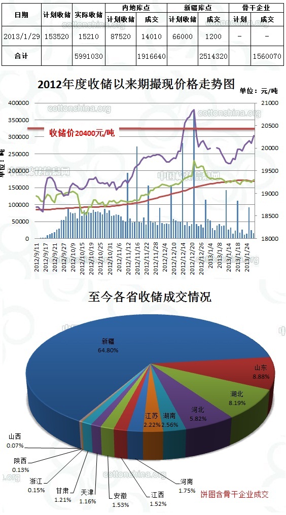 1月29日,計(jì)劃收儲(chǔ)153520噸,實(shí)際成交15210噸,成交比例9.9%,較前一天減少9880噸。其中新疆庫(kù)點(diǎn)計(jì)劃收儲(chǔ)66000噸,實(shí)際成交1200噸,成交比例1.8%;內(nèi)地庫(kù)計(jì)劃收儲(chǔ)87520噸,實(shí)際成交14010噸,成交比例16.0%。