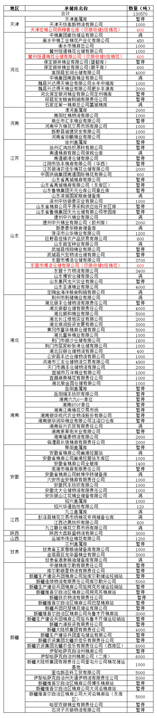 定于1月5日在以下指定倉庫收儲2012年度棉花130570噸。哈密雙銀棉業(yè)有限責任公司僅限東疆棉花企業(yè)競拍,新疆維吾爾自治區(qū)棉麻公司博樂棉麻站僅限于博樂地區(qū)棉花企業(yè)競拍,以上庫點其他地區(qū)企業(yè)競拍將按違約處理。