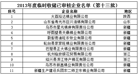 2013年度棉花臨時收儲已審核企業(yè)名單(第十三批)