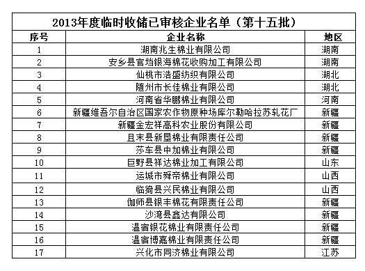 2013年度棉花臨時(shí)收儲(chǔ)已審核企業(yè)名單(第十五批)