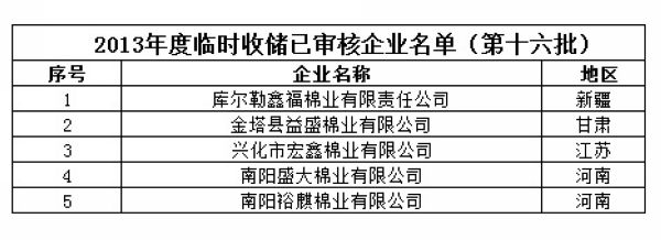 2013年度棉花臨時收儲已審核企業(yè)名單(第十六批)
