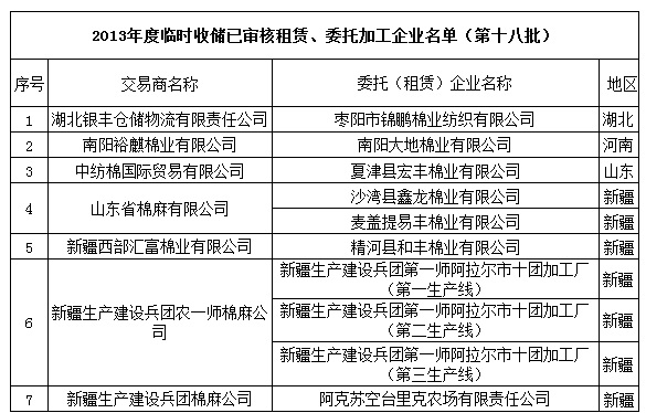2013年度棉花臨時(shí)收儲(chǔ)已審核租賃、委托加工企業(yè)名單(第十八批)