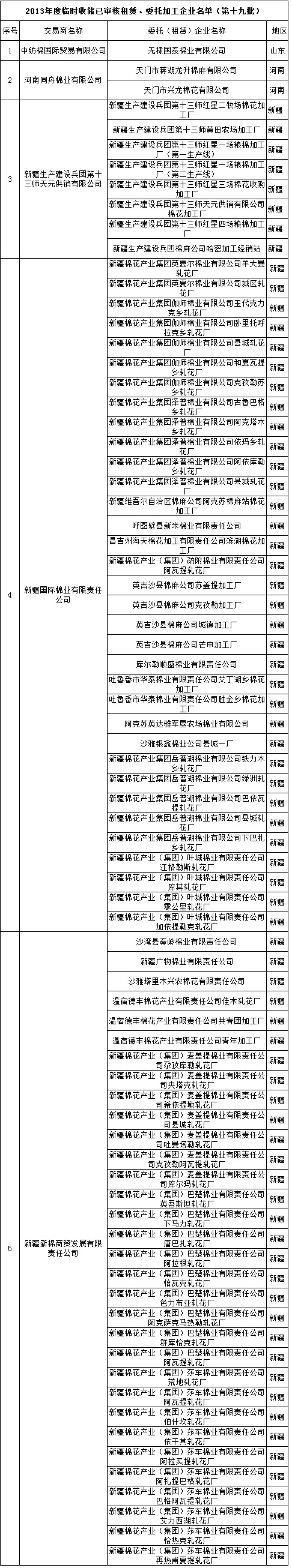2013年度棉花臨時(shí)收儲(chǔ)已審核租賃、委托加工企業(yè)名單(第十九批)