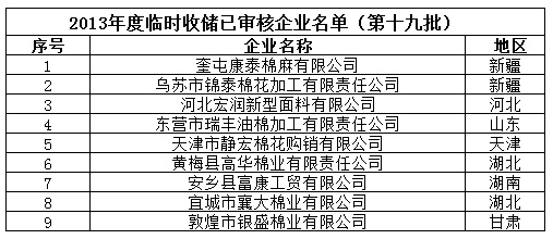 2013年度棉花臨時(shí)收儲(chǔ)已審核企業(yè)名單(第十九批)