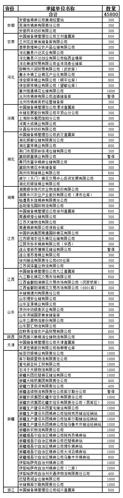 10月21日計劃在以下指定倉庫收儲2013年度棉花45800噸。