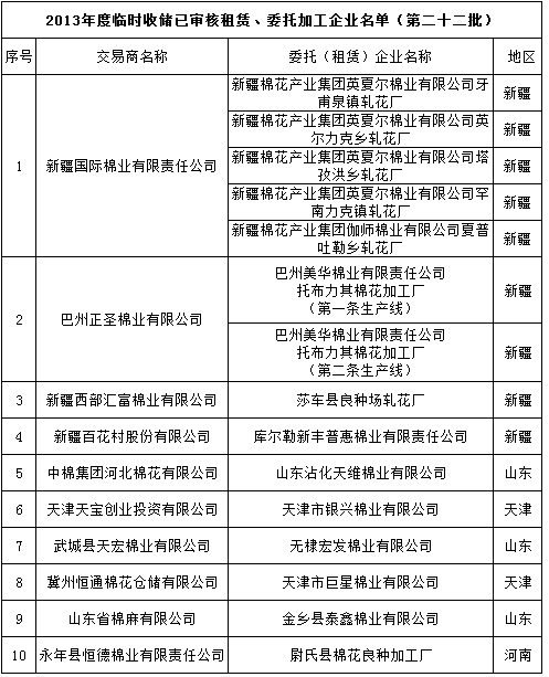 2013年度棉花臨時(shí)收儲(chǔ)已審核租賃、委托加工企業(yè)名單(第二十二批)
