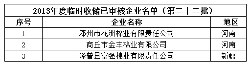 2013年度棉花臨時(shí)收儲(chǔ)已審核企業(yè)名單(第二十二批)