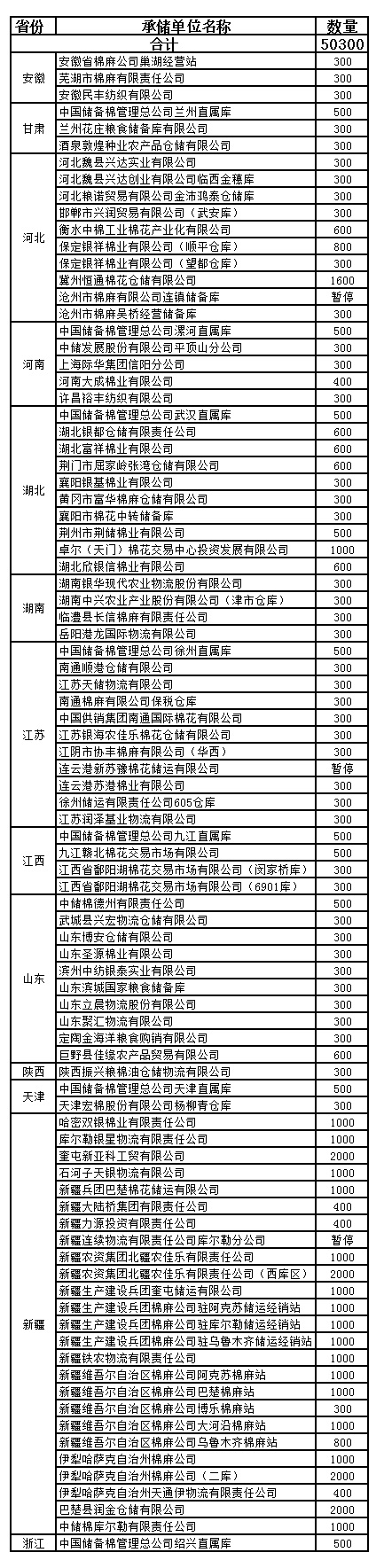10月22日計劃在以下指定倉庫收儲2013年度棉花50300噸。