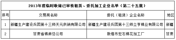 2013年度棉花臨時收儲已審核租賃、委托加工企業(yè)名單(第二十五批)
