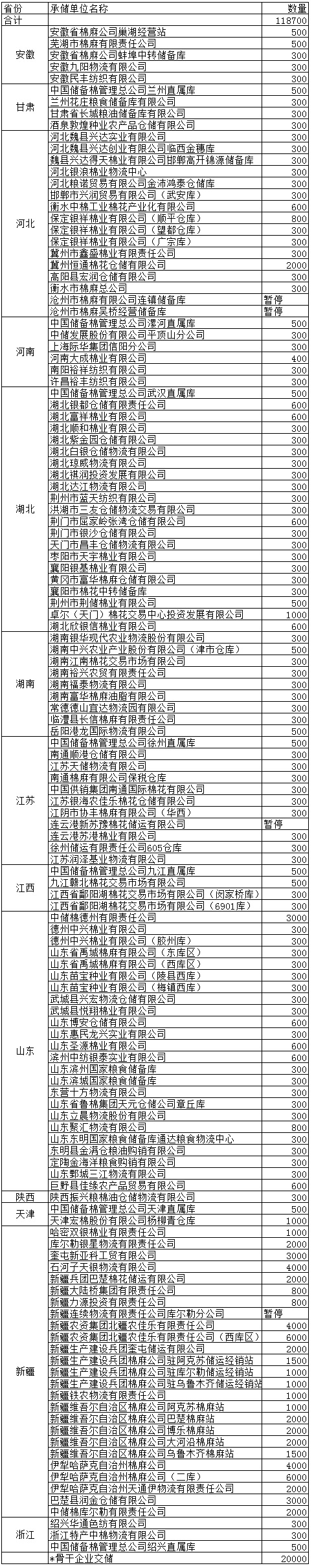 10月28日計劃在以下指定倉庫收儲2013年度棉花118700噸(含骨干企業(yè)交儲棉花20000噸)。