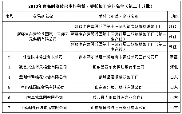 2013年度棉花臨時(shí)收儲已審核租賃、委托加工企業(yè)名單(第二十八批)