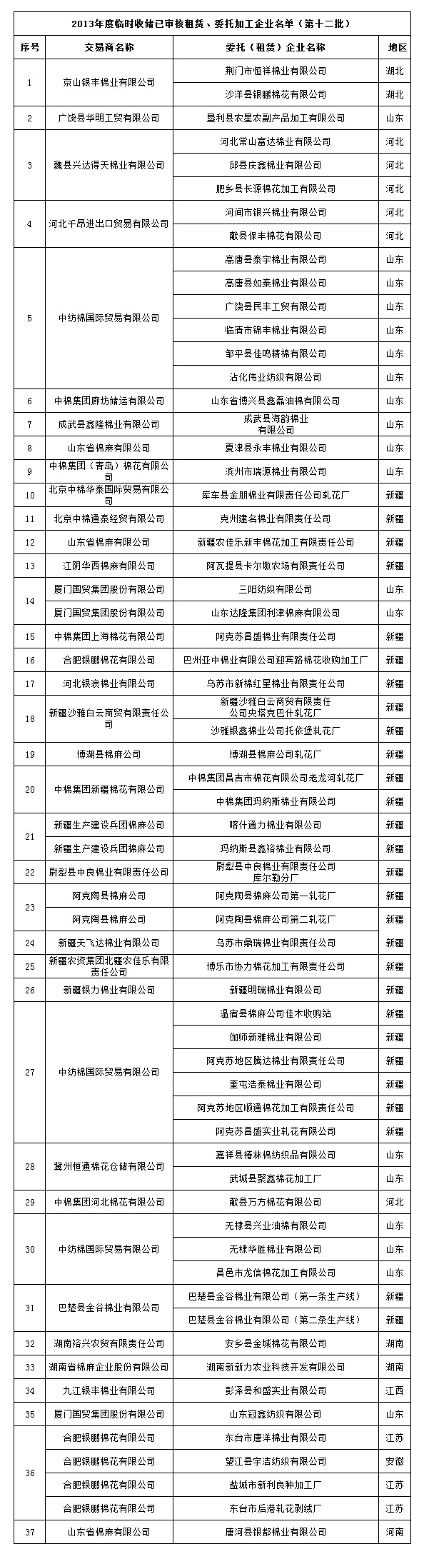 2013年度棉花臨時(shí)收儲(chǔ)已審核租賃、委托加工企業(yè)名單(第十二批)
