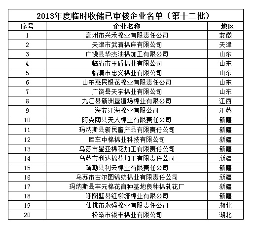 2013年度棉花臨時收儲已審核企業(yè)名單(第十二批)