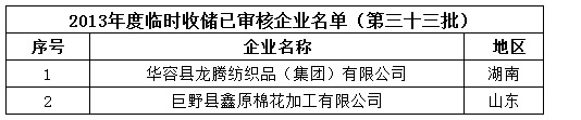 2013年度棉花臨時(shí)收儲(chǔ)已審核企業(yè)名單(第三十三批)