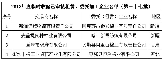 2013年度棉花臨時(shí)收儲(chǔ)已審核租賃、委托加工企業(yè)名單(第三十七批)