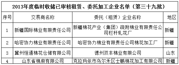2013年度棉花臨時(shí)收儲已審核租賃、委托加工企業(yè)名單(第三十九批)