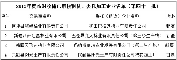 2013年度棉花臨時收儲已審核租賃、委托加工企業(yè)名單(第四十一批)