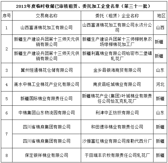 2013年度棉花臨時收儲已審核租賃、委托加工企業(yè)名單(第三十一批)