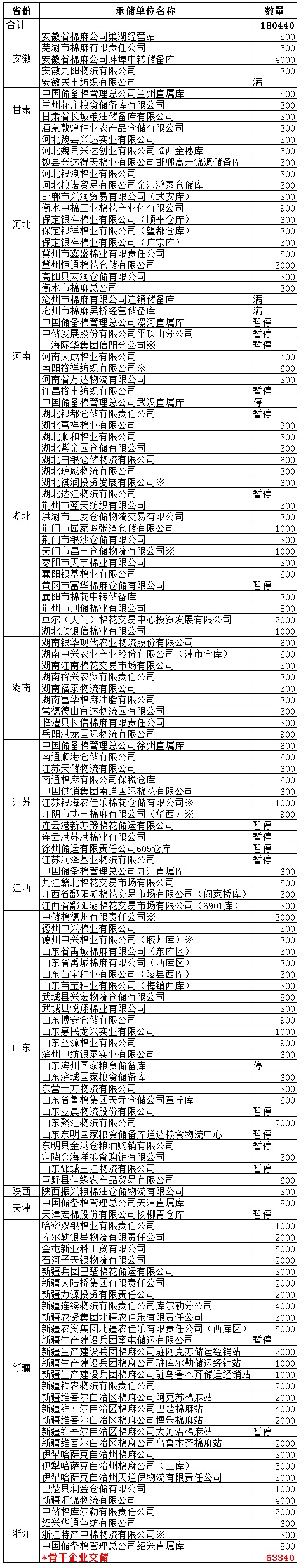 為了滿足新疆企業(yè)交儲需要,緩解新疆地區(qū)入庫壓力,在不影響內(nèi)地就近交儲的前提下,以下帶“※”庫點作為內(nèi)地接收新疆棉花交儲的指定庫點。