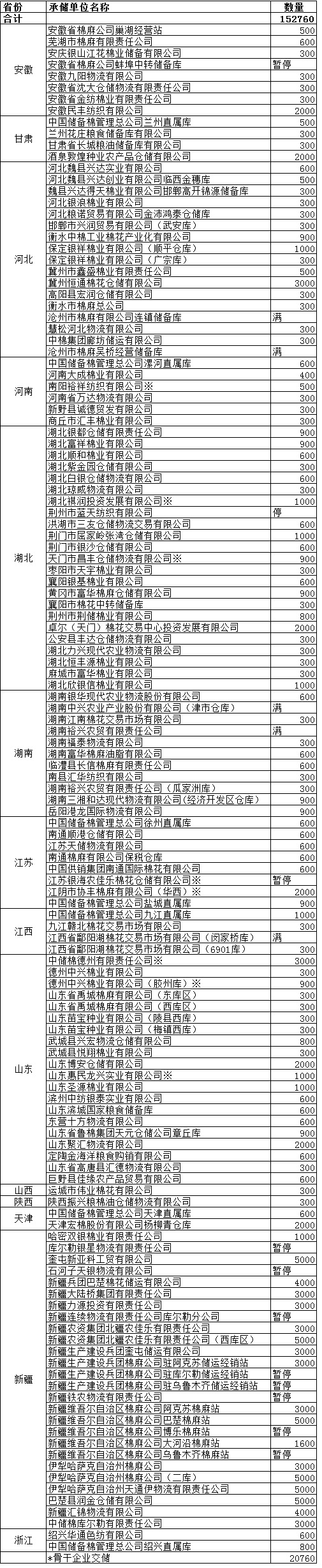 為了滿足新疆企業(yè)交儲需要,緩解新疆地區(qū)入庫壓力,在不影響內(nèi)地就近交儲的前提下,以下帶“※”庫點作為內(nèi)地接收新疆棉花交儲的指定庫點。