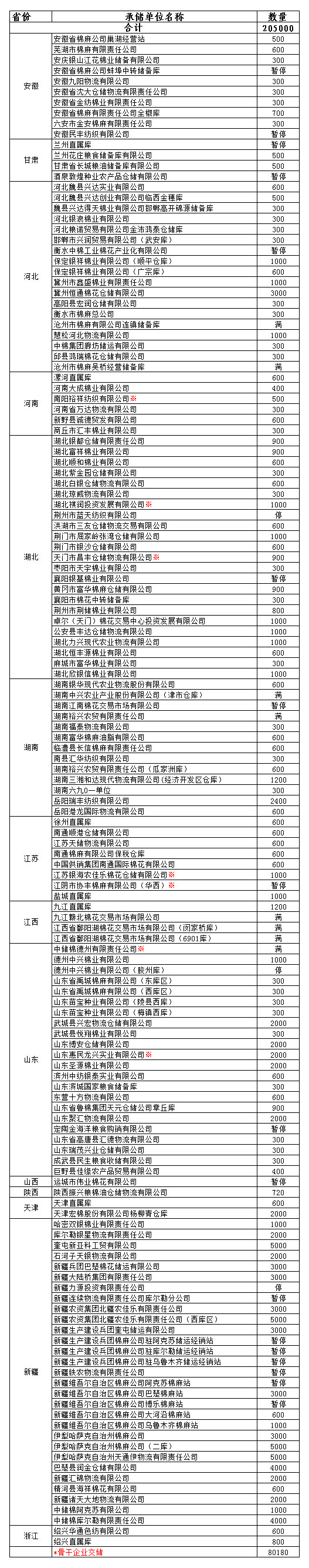 各涉棉企業(yè): 12月20日在以下指定倉庫收儲2013年度棉花205000噸(含骨干企業(yè)交儲棉花80180噸)。 為了滿足新疆企業(yè)交儲需要,緩解新疆地區(qū)入庫壓力,在不影響內地就近交儲的前提下,以下帶“※”庫點作為內地接收新疆棉花交儲的指定庫點。