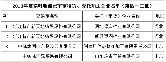 2013年度棉花臨時(shí)收儲(chǔ)已審核租賃、委托加工企業(yè)名單(第四十二批)