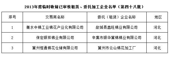 2013年度棉花臨時(shí)收儲已審核租賃、委托加工企業(yè)名單(第四十八批)
