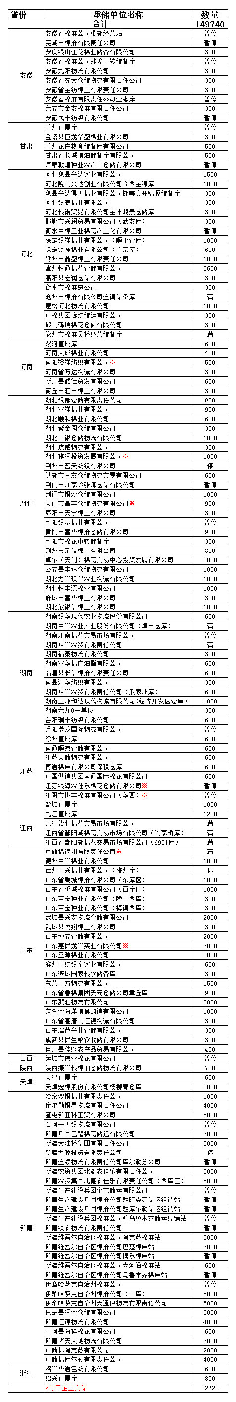 各涉棉企業(yè): 12月31日在以下指定倉庫收儲2013年度棉花149740噸(含骨干企業(yè)交儲棉花22720噸)。 為了滿足新疆企業(yè)交儲需要,緩解新疆地區(qū)入庫壓力,在不影響內(nèi)地就近交儲的前提下,以下帶“※”庫點作為內(nèi)地接收新疆棉花交儲的指定庫點。