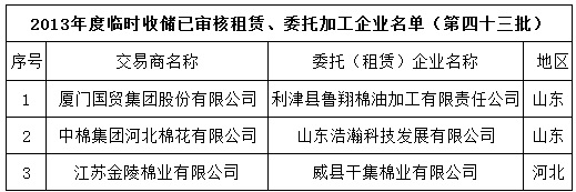 2013年度棉花臨時收儲已審核租賃、委托加工企業(yè)名單(第四十三批)