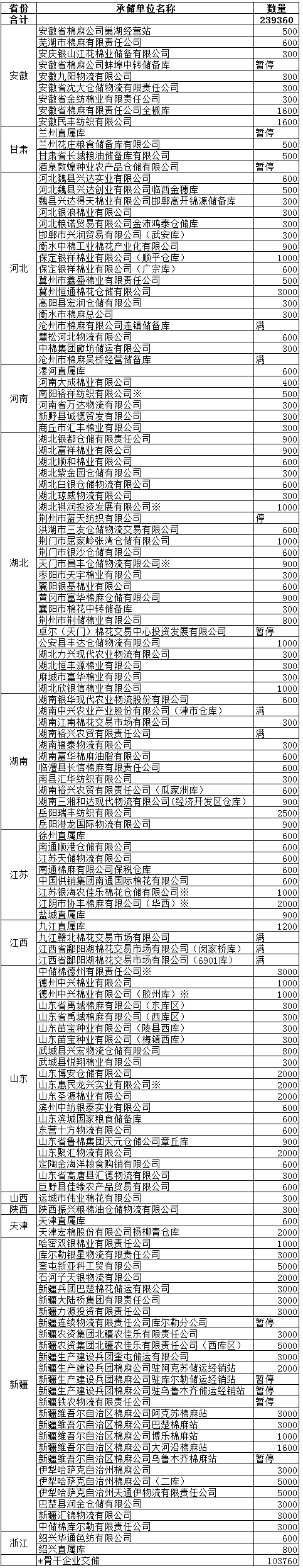為了滿足新疆企業(yè)交儲(chǔ)需要,緩解新疆地區(qū)入庫(kù)壓力,在不影響內(nèi)地就近交儲(chǔ)的前提下,以下帶“※”庫(kù)點(diǎn)作為內(nèi)地接收新疆棉花交儲(chǔ)的指定庫(kù)點(diǎn)。