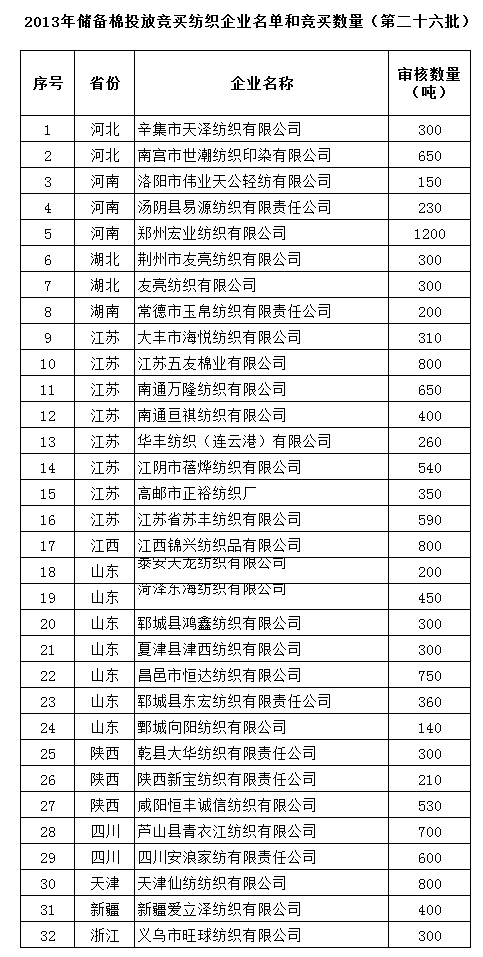 2013年儲(chǔ)備棉投放競(jìng)買紡織企業(yè)名單和競(jìng)買數(shù)量(第二十六批)