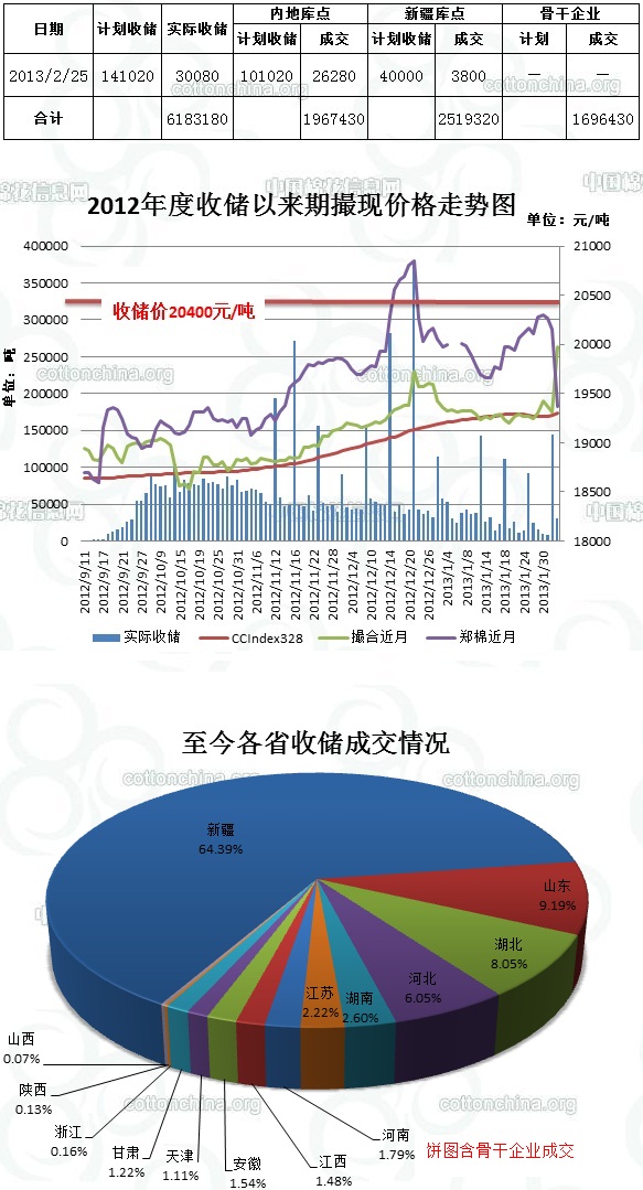 截至今日2012年度棉花臨時收儲累計成交6183180噸,新疆累計成交2519320噸,內(nèi)地累計成交1967430噸,骨干企業(yè)共累計成交1696430噸。