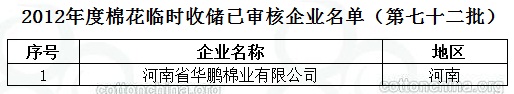 2012年度棉花臨時(shí)收儲已審核企業(yè)名單(第七十二批)