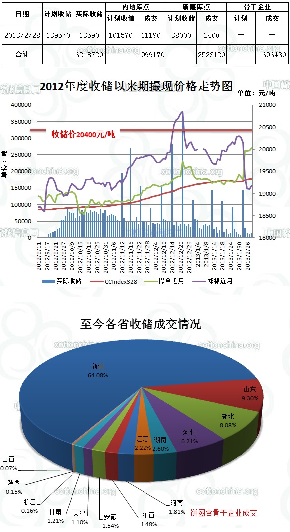 截至今日2012年度棉花臨時收儲累計成交6218720噸,新疆累計成交2523120噸,內(nèi)地累計成交1999170噸,骨干企業(yè)共累計成交1696430噸。