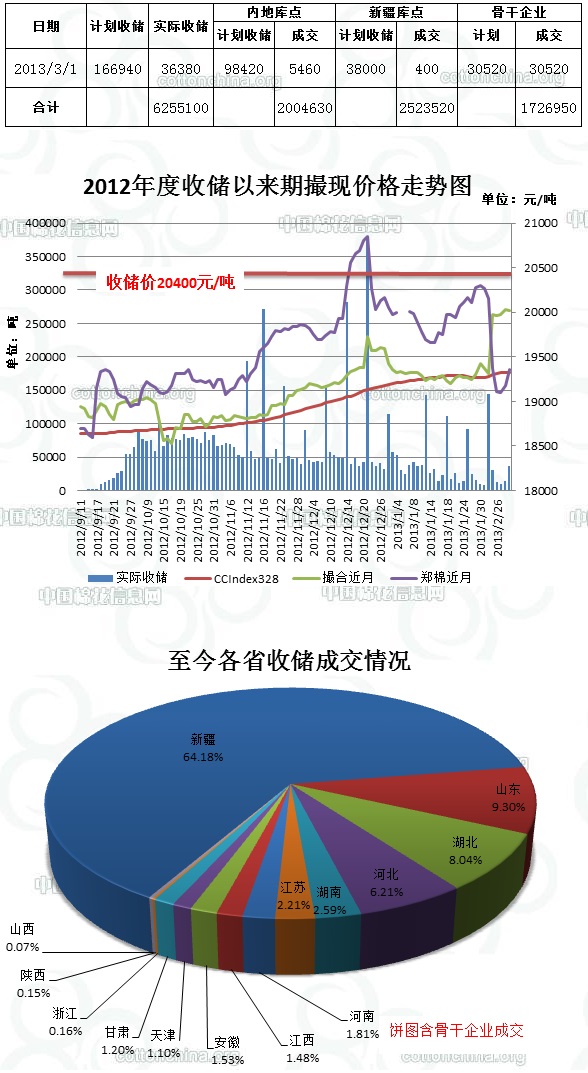 截至今日2012年度棉花臨時收儲累計(jì)成交6255100噸,新疆累計(jì)成交2523520噸,內(nèi)地累計(jì)成交2004630噸,骨干企業(yè)共累計(jì)成交1726950噸。